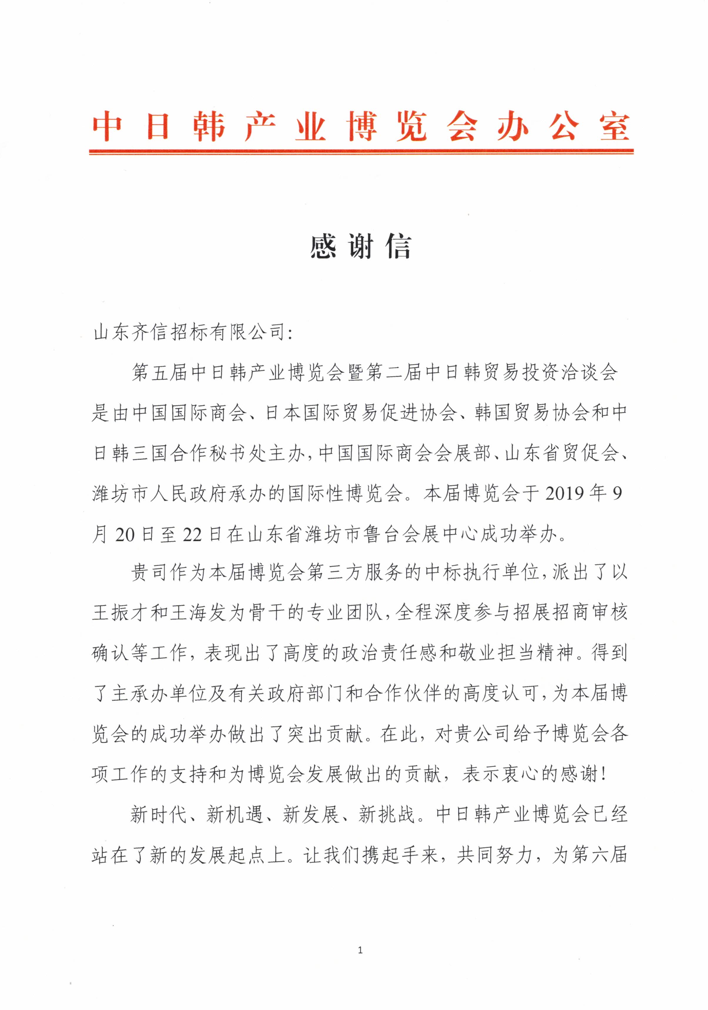 日前,齊信收到來(lái)自中日韓產(chǎn)業(yè)博覽會(huì)辦公室發(fā)來(lái)的感謝信,對(duì)齊信給予博覽會(huì)各項(xiàng)工作的支持及付出的努力表示衷心感謝。9月22日,第五屆中日韓產(chǎn)業(yè)博覽會(huì)暨第二屆中日韓貿(mào)易投資洽談會(huì)圓滿(mǎn)落幕。齊信作為本屆博覽會(huì)第三方服務(wù)的中標(biāo)執(zhí)行單位,全程深度參與了招展招商審核確認(rèn)等工作。齊信專(zhuān)業(yè)的服務(wù)團(tuán)隊(duì)和敬業(yè)擔(dān)當(dāng)精神得到了主辦單位及有關(guān)政府部門(mén)的高度認(rèn)可。