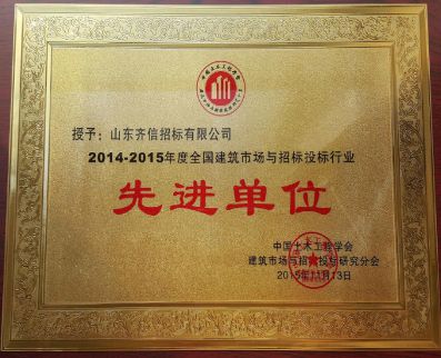 2015年,11月13日,在中國(guó)土木工程學(xué)會(huì)建筑市場(chǎng)與招投標(biāo)研究分會(huì)開展的2014-2015年度“全國(guó)建筑市場(chǎng)與招標(biāo)投標(biāo)先進(jìn)單位”評(píng)選活動(dòng)中,經(jīng)各省、自治區(qū)、直轄市相關(guān)部門評(píng)選推薦并報(bào)中國(guó)土木工程學(xué)會(huì)建筑市場(chǎng)與招標(biāo)投標(biāo)研究分會(huì)評(píng)審,山東齊信招標(biāo)有限公司被評(píng)為“先進(jìn)單位”稱號(hào)。