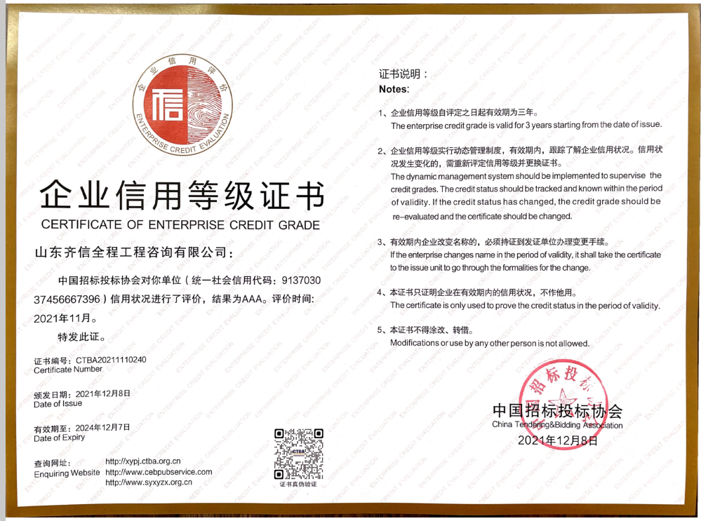 2021年12月,中國(guó)招標(biāo)投標(biāo)協(xié)會(huì)發(fā)布《招標(biāo)代理機(jī)構(gòu)2021年信用評(píng)價(jià)結(jié)果公示名單》,齊信獲評(píng)2021年招標(biāo)代理機(jī)構(gòu)信用評(píng)價(jià)AAA級(jí)企業(yè)(最高等級(jí))。