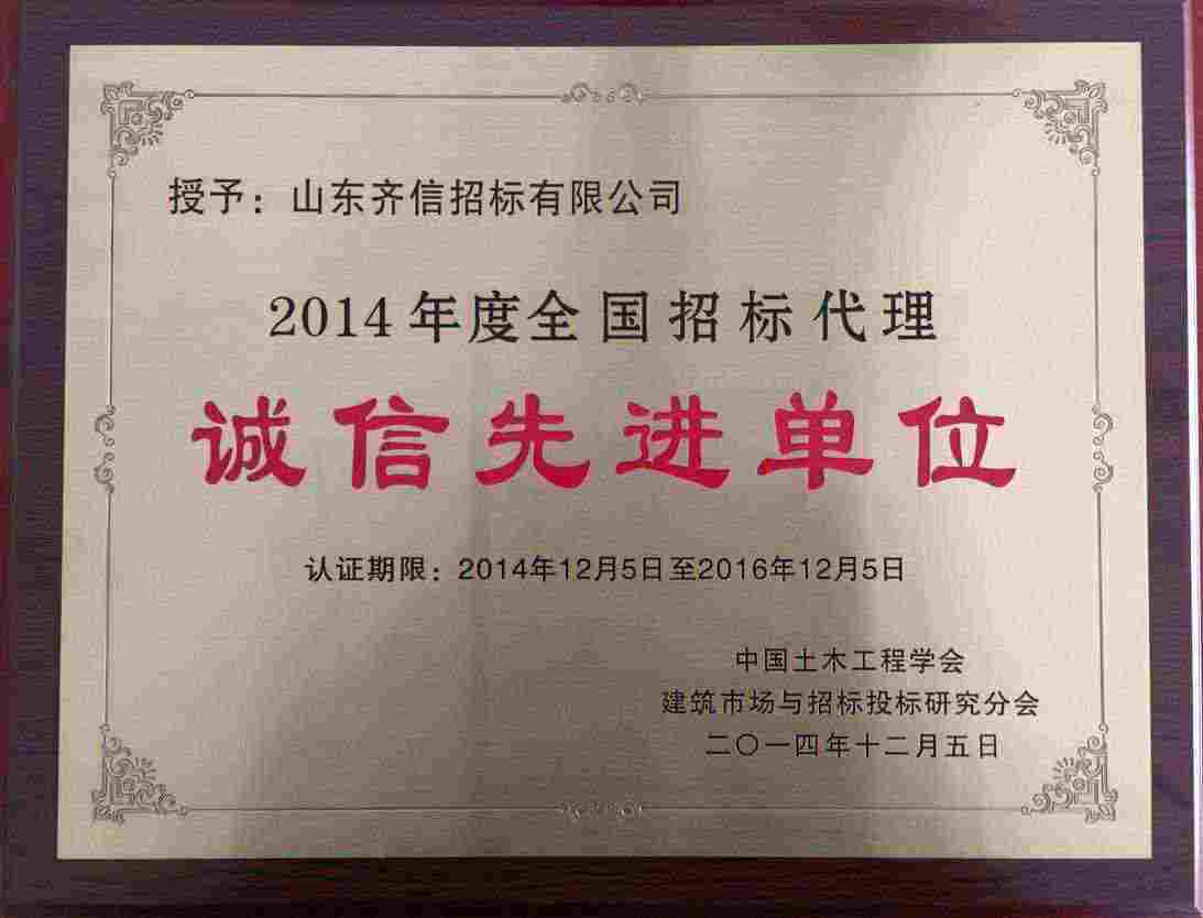 近日,在中國(guó)土木工程學(xué)會(huì)建筑市場(chǎng)與招投標(biāo)研究分會(huì)(以下簡(jiǎn)稱分會(huì))開(kāi)展的“全國(guó)招標(biāo)代理誠(chéng)信先進(jìn)單位表彰活動(dòng)”中,山東齊信招標(biāo)有限公司被評(píng)為“2014年度全國(guó)招標(biāo)代理誠(chéng)信先進(jìn)單位”稱號(hào)。