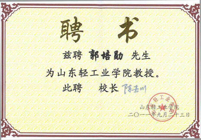 九月二十三日,我公司董事長郭培勛先生(中)受聘山東輕工業(yè)學院教授聘書頒發(fā)儀式在學院會議廳舉行,山東輕工業(yè)學院校長陳嘉川(左)親自為郭培勛先生頒發(fā)聘書,院黨委書記徐同文(右)出席了聘書頒發(fā)儀式。