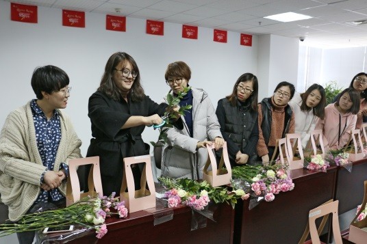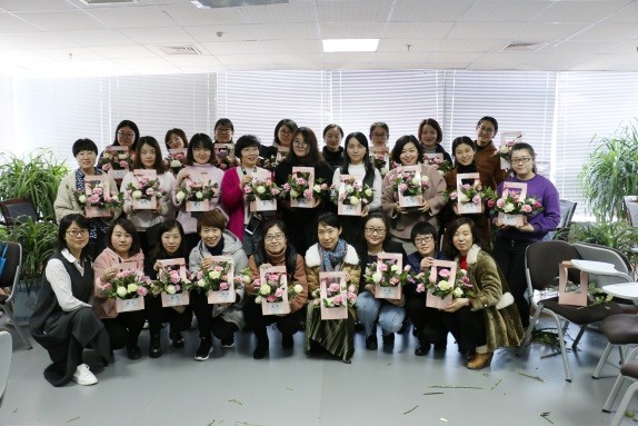 在短暫的介紹之后就是本次活動(dòng)的高潮環(huán)節(jié),開始實(shí)踐插花。浪漫粉色的玫瑰,零星點(diǎn)點(diǎn)的滿天星,還有各色花卉放滿了桌子。大家插花時(shí),講究色彩搭配,錯(cuò)落有致,也有藝術(shù)感滿分的同事開始了與眾不同的藝術(shù)插花,同樣美麗別致。熱鬧的一個(gè)上午很快就過去了,活動(dòng)圓滿地落下了帷幕。每位女同事都手捧鮮花,歡度佳節(jié)。